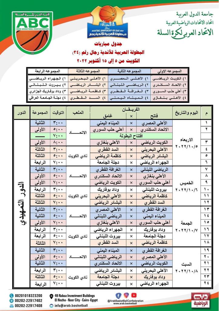 يبدأ فريقا الاهلي المصري والاتحاد السكندري ميارياتهما اليوم في البطولة العربية للأندية لكرة السلة المقامة بالكويت