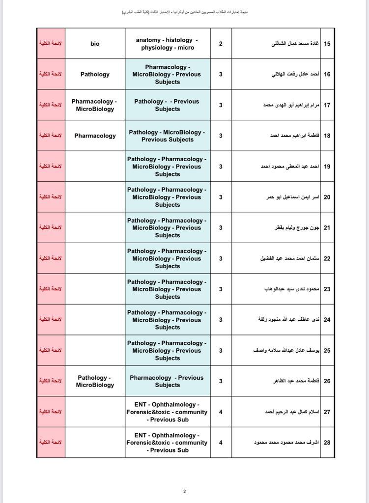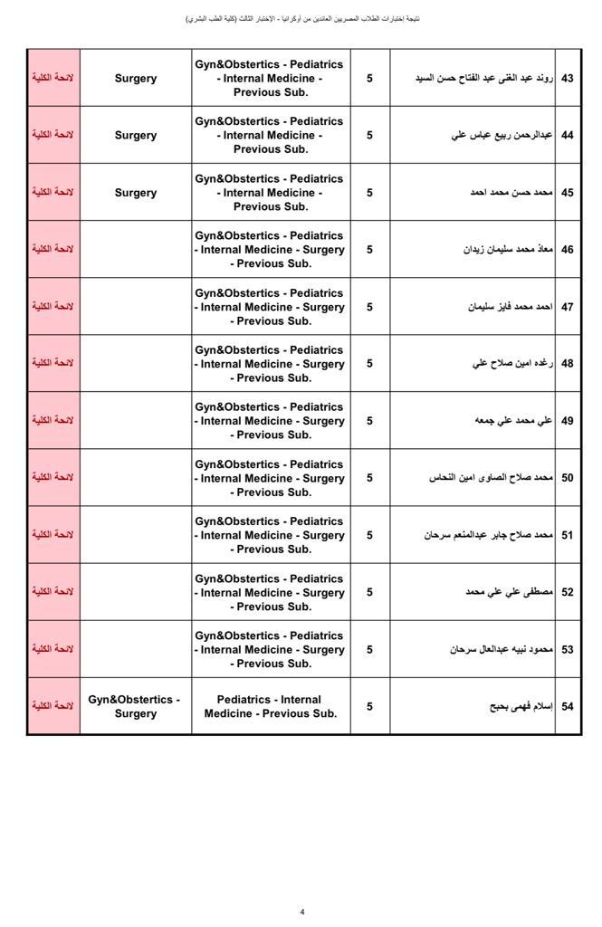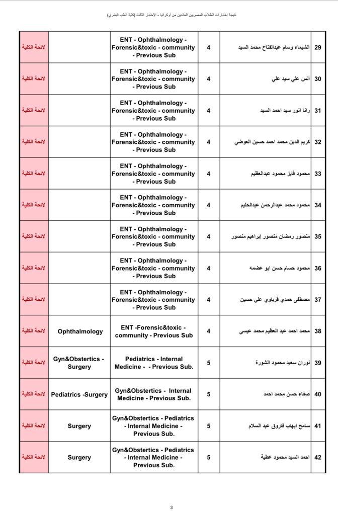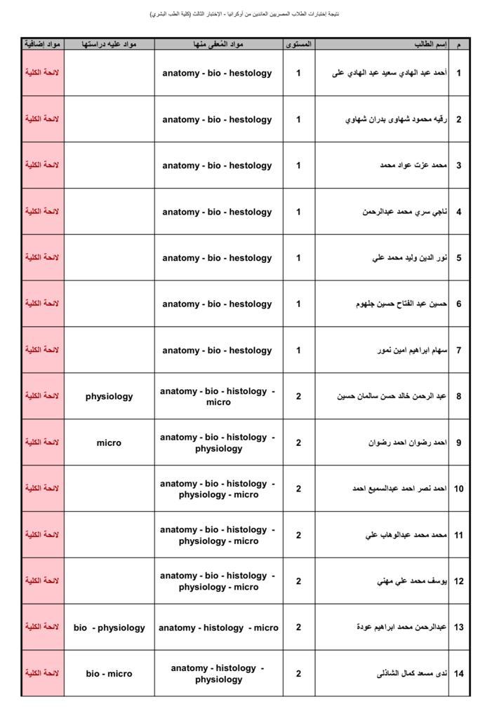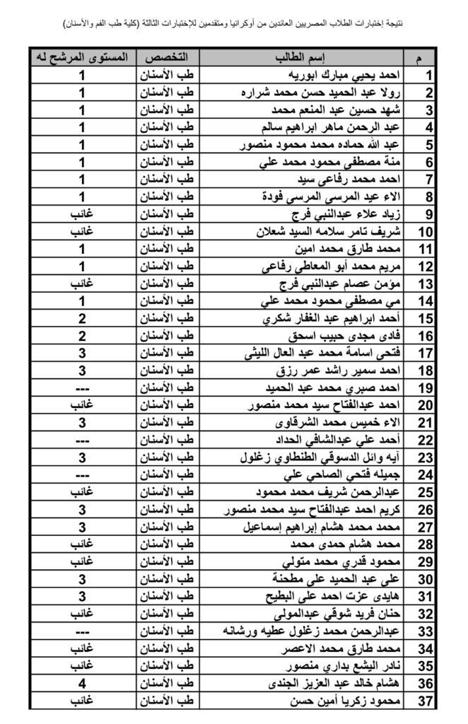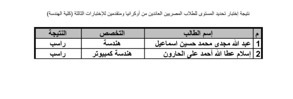 في إطار التنسيق المُستمر بين وزارة الدولة للهجرة وشئون المصريين بالخارج، ووزارة التعليم العالي والبحث العلمي، وتنفيذًا لتوجيهات الرئيس عبد الفتاح السيسي، بشأن الطلاب المصريين الدارسين بالجامعات الأوكرانية، تنشر وزارة الهجرة، نتائج اختبارات تحديد المستوى للطلاب المصريين العائدين من دولة أوكرانيا، للمرة الثالثة، وذلك في عدة كليات في عدد من الجامعات الحكومية والخاصة والأهلية.