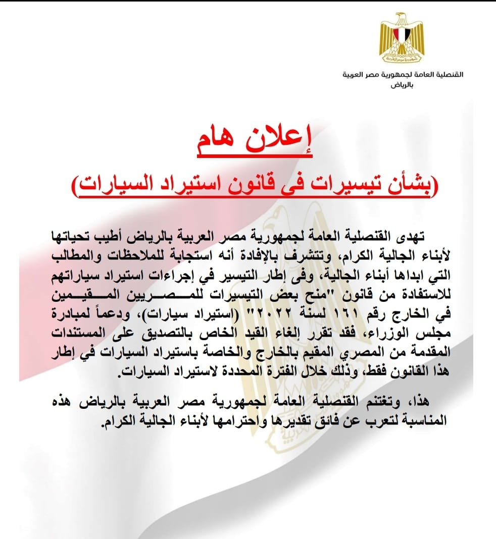 تهدى القنصلية العامة لجمهورية مصر العربية بالرياض أطيب تحياتها لأبناء الجالية الكرام، وتتشرف بالإفادة أنه استجابة للملاحظات والمطالب التي ابداها أبناء الجالية، وفي إطار التيسير في إجراءات استيراد سياراتهم للاستفادة من قانون “منح بعض التيسيرات للمـصـريين المـقيـمين