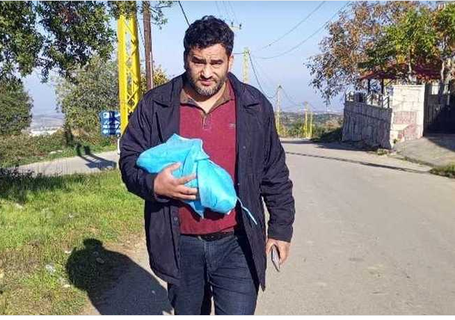 وتظهر الصورة الوالد حسين البعريني، وهو يحمل طفله الرضيع، ملفوفاً بقطعة قماش زرقاء، بعدما لفظ أنفاسه داخل مستشفى في عكار بشمال لبنان.