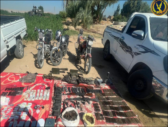 وعُثر بمحل الضبط على (كمية من مخدر الحشيش وزنت 10 كيلو جرام – كمية من مخدر الشابو وزنت 1 كيلو جرام– كمية من مخدر الأفيون وزنت 500 جرام – كمية من مخدر الهيروين وزنت 100 جرام – عدد 1440 قرص مخدر – 2 فرد محلى – طبنجة – 10 خزينة – كمية من الذخائر – 5 ميزان حساس – 3 دراجة نارية – 2 سيارة ربع نقل – مبلغ مالى ) .