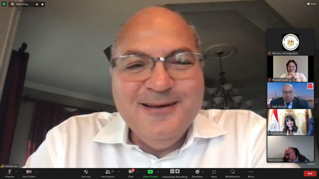 وبحضور عدد من أبرز رموز الجالية المصرية بكندا، بدأ اللقاء الافتراضي بتوجيه الأستاذ عادل بولس، رئيس الجمعية المصرية الكندية لرجال الأعمال، ومنظم اللقاء، التقدير والشكر للوزيرة سها جندي على تنظيم المؤتمر الثالث للكيانات المصرية بالخارج، وما تبذله من جهد منذ توليها منصب وزيرة الهجرة، للتواصل والوقوف على أوضاع الجاليات المصرية في مختلف دول العالم.