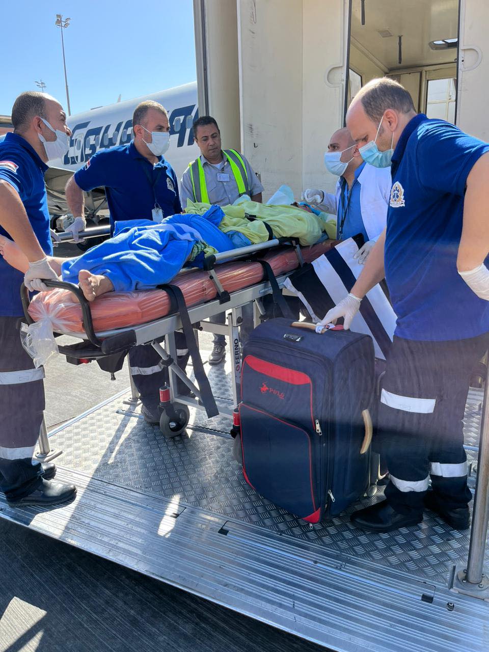 من جانبها، تقدمت السفيرة سها جندي وزيرة الهجرة بعميق شكرها للدكتور خالد عبد الغفار وزير الصحة، والدكتور محمد جاد رئيس هيئة الإسعاف، لتوفير عربة إسعاف مجهزة بطاقم من الأطباء والمسعفين، لاستقبال الشاب بالمطار ونقله لمستشفى دار الشفاء؛ حيث تم توفير غرفة رعاية مركزة بها لاستكمال العلاج، كما توجهت بالشكر إلى السيد وزير الطيران المدني، حيث تم التنسيق مع مكتب سيادته وقطاع العلاقات العامة بشركة ميناء القاهرة الجوي، والتي قدمت كل التيسيرات لاستقبال الشاب وسرعة نقله وإنهاء كافة الإجراءات اللازمة للشاب المصري والطبيب المرافق وبالتنسيق مع الأطباء وسيارة الإسعاف.