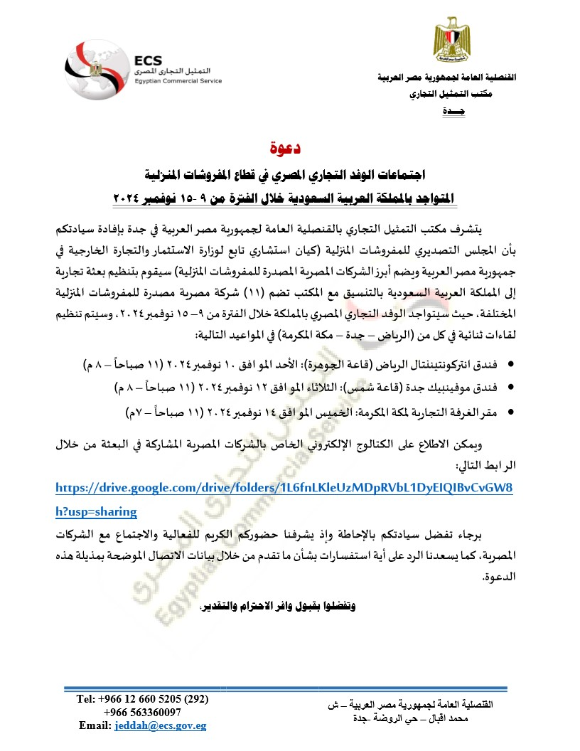 أعلنت القنصلية المصرية في الرياض عن دعوة من مكتب التمثيل العمالي بشأن قيام بعثة تجارية مصرية تضم 11 شركة مصرية مصدرة للمفروشات المنزلية المختلفة بزيارة للمملكة العربية السعودية (الرياض- جدة- مكة المكرمة) خلال الفترة من 9-15 نوفمبر 2024