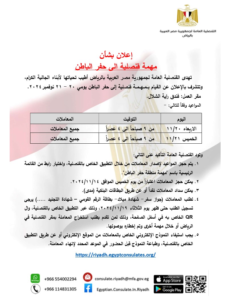 أعلنت قنصلية مصر في الرياض عن القيام بمهمة قنصلية إلى حفر الباطن يومي 20- 21 نوفمبر 2024.