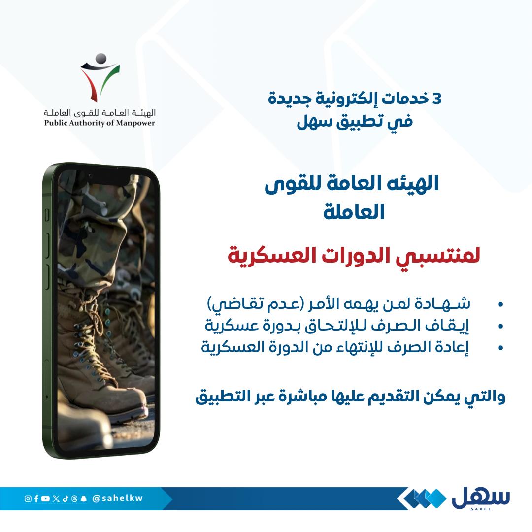 دشنت الهيئة العامة للقوى العاملة في الكويت 3 خدمات إلكترونية جديدة عبر تطبيق سهل لمنتسبي الدورات العسكرية، هي: