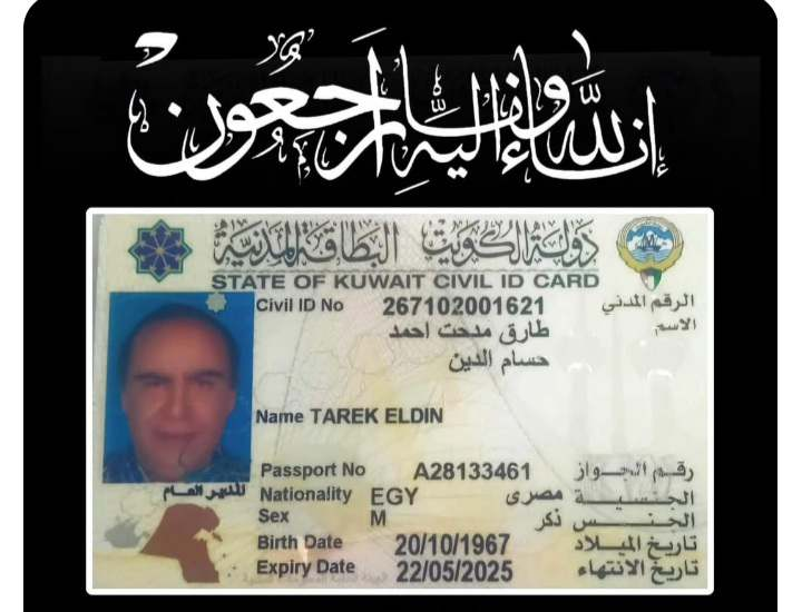 مواطن مصري بالكويت، يدعى الحاج/ طارق مدحت أحمد حسام الدين، تعرض منذ يومين لحادث أليم أدى إلى وفاته، وقام رجال مخفر مبارك الكبير بالانتقال إلى موقع الحادث وكشف ملابساته، وكثفوا البحث عن أقارب المواطن المصري فقيد الغربة وذلك عن طريق الإعلان عن الحادث ومحاولة الاستدلال عن أية معلومات عن عائلته أو ذويه، واكتشفوا أن الفقيد ليس له أقارب بدولة الكويت.
