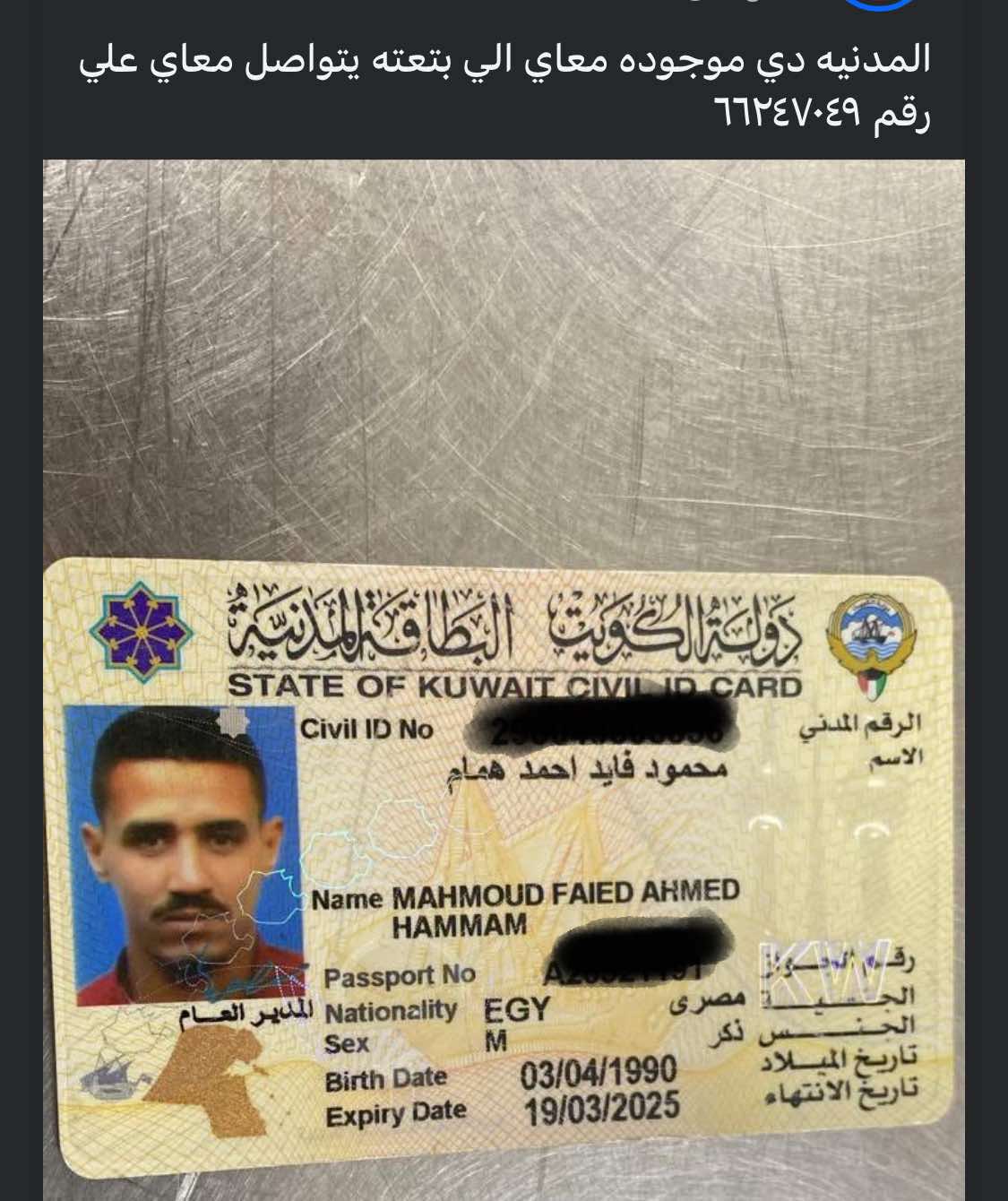 تم العثور على مدنية مفقودة لمواطن مصري في الكويت باسم محمود فايد أحمد همام التواصل على رقم ٦٦٤٢٧٠٤٩