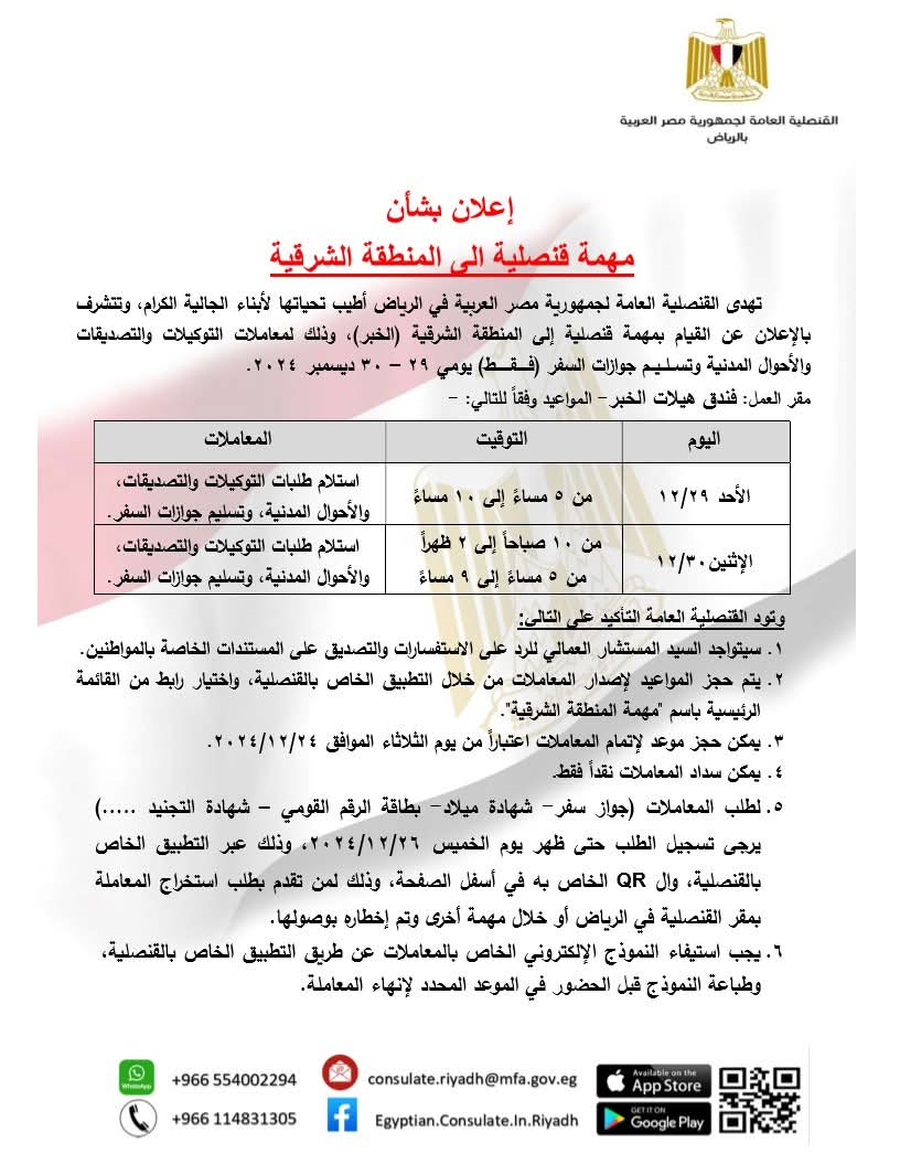 أعلنت القنصلية المصرية في الرياض عن القيام بمهمة قنصلية إلى المنطقة الشرقية (الخبر) وذلك لمعاملات التوكيلات والتصديقات والاحوال المدنية وتسليم جوازات السفر (فقط) يومي 29- 30 ديسمبر 2024