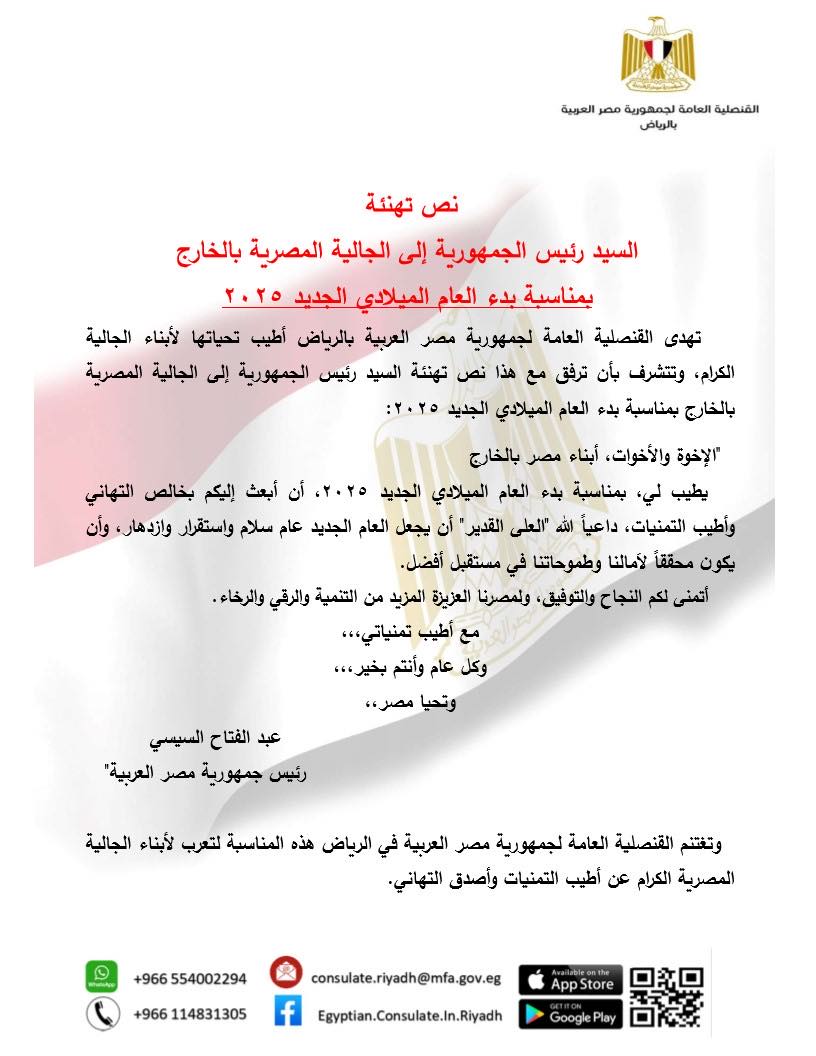نشرت القنصلية المصرية بالرياض نص تهنئة الرئيس عبدالفتاح السيسي للجالية المصرية بالخارج بمناسبة بدء العام الميلادي الجديد ٢٠٢٥، وجاء نصها كالاتي:-