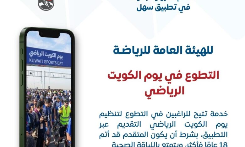دشنت الهيئة العامة للرياضة خدمة إلكترونية جديدة عبر تطبيق سهل وهو التطوع في يوم الكويت الرياضي والتي تتيح للراغبين في التطوع لتنظيم #يومالكويتالرياضي التقديم عبر #سهل.