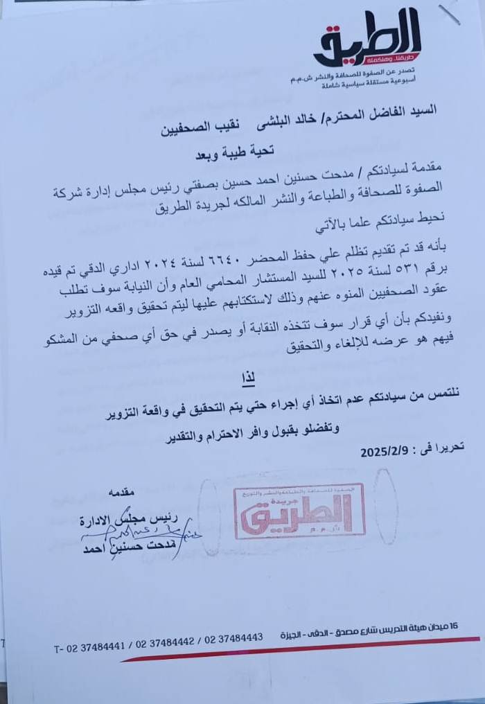 “محمد. ص. ع، وأحمد. ع. ا، ومحمود. م. س ومحمد. س. إ، قيدت برقم ٢٥٤٨٨ لسنة ٢٠٢٤ عرائض يتهم فيها الشاكي المشكو في حقهم بأننا اكتشفنا مخالفات عديدة ضد المشكو في حقهم وقامت الشركة بفصلهم وإحالتهم للتحقيق وكانت تلك الشكاوى تتلخص في تزوير توقيع رئيس مجلس الإدارة (الشاكي) على عقود تعيين الصحفيين وخطابات النقابة وتم سرد الوقائع تفصيلية بالعربضة سالفة الذكر ومنها قيام المشكو في حقه الأول بتعيين زوجته وابنته وأخيه بأوراق دون علم رئيس مجلس إدارة الطريق