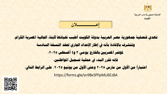 نشرت قنصلية جمهورية مصر العربية في الكويت اليوم الاربعاء الموافق 19 فبراير 2025 إعلان عبر صفحتها الرسمية علي موقع التواصل الاجتماعي الفيس بوك قامت فيه بأهداء أطيب تحياتها لأبناء الجالية المصرية الكرام
