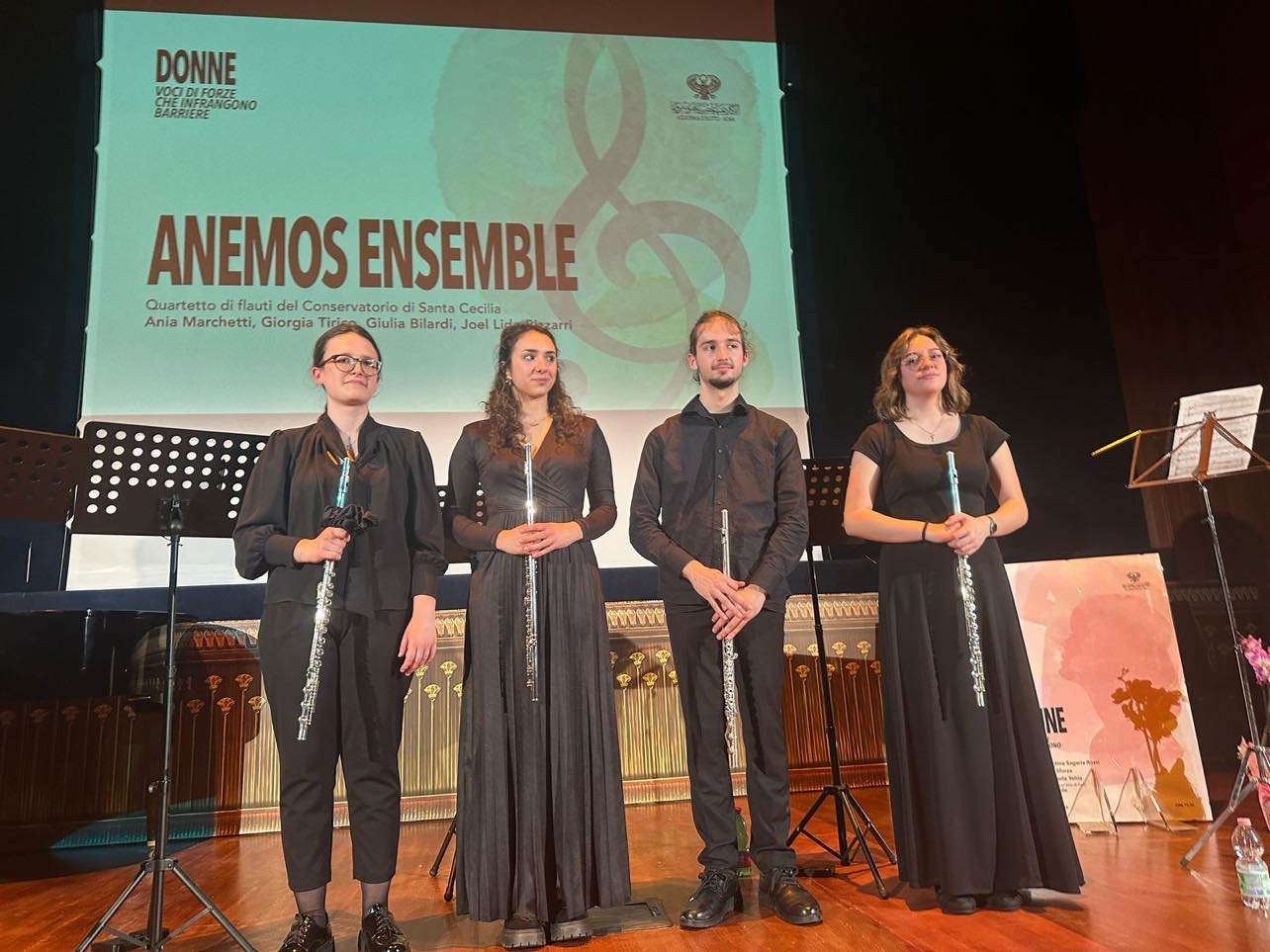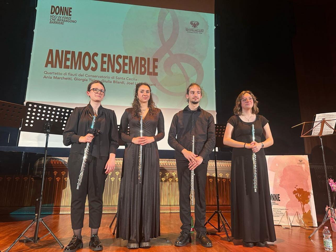 وأختتمت الفعالية بتقديم حفل موسيقى لرباعى فلوت “انيموس انسامبل” من طلاب كونسيرفتوار سانتا شيشيليا الذين تعاونت معه الأكاديمية فى كثير من الفعاليات خلال الفترة الماضية وهو واحد من أهم المعاهد الموسيقية فى إيطاليا وأوربا، وقد قدم الطلاب آنا مارشيتى، جورجيا تيريكو،جويل ليدو بيزارى، جوليا بيلاردى عدداً من المؤلفات الموسيقية الكلاسيكية لكل من تيليمان، جلوك، تشايكوفسكى، مارشيللو، بيزيه، سميتانا والتى لاقت استحساناً كبيراً من الجمهور الحضور، وخاصة لمستواهم الفنى المتميز، يذكر أن هذه المجموعة تحت إشراف المايسترو فرانشيسكو ليوناردى.