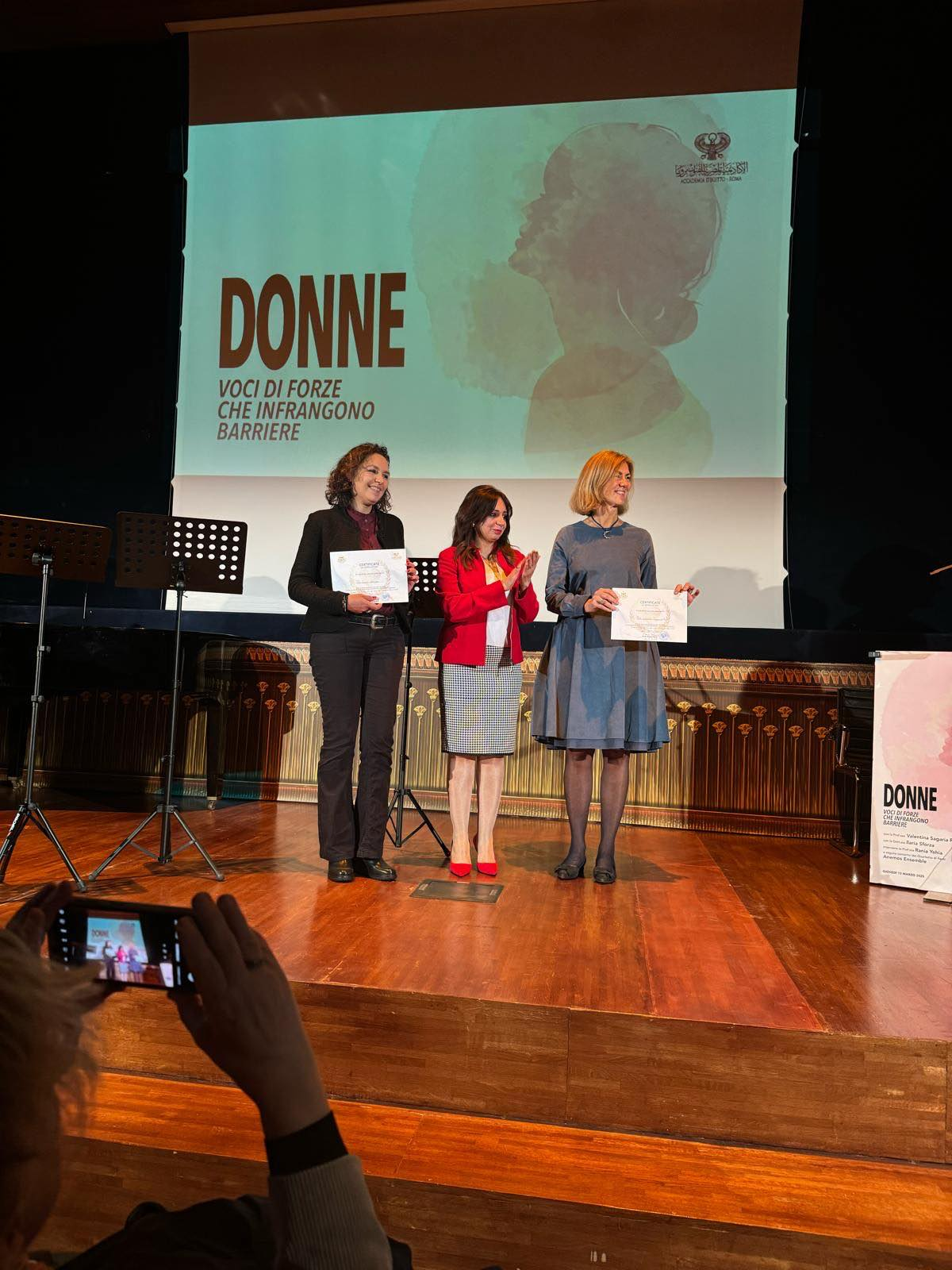 فى إطار الاحتفالات بيوم المرأة العالمى أقامت الأكاديمية المصرية للفنون بروما برئاسة الأستاذة الدكتورة رانيا يحيى فعالية ثقافية فنية بمشاركة كل من الأستاذة الإيطالية فالنتينا سجاريا روسسى أستاذة اللغة العربية والأدب بجامعة تورفرجاتا بروما، والدكتورة ايلاريا سفورتزا الشاعرة والمتخصصة فى الآثار الكلاسيكية بنفس الجامعة.