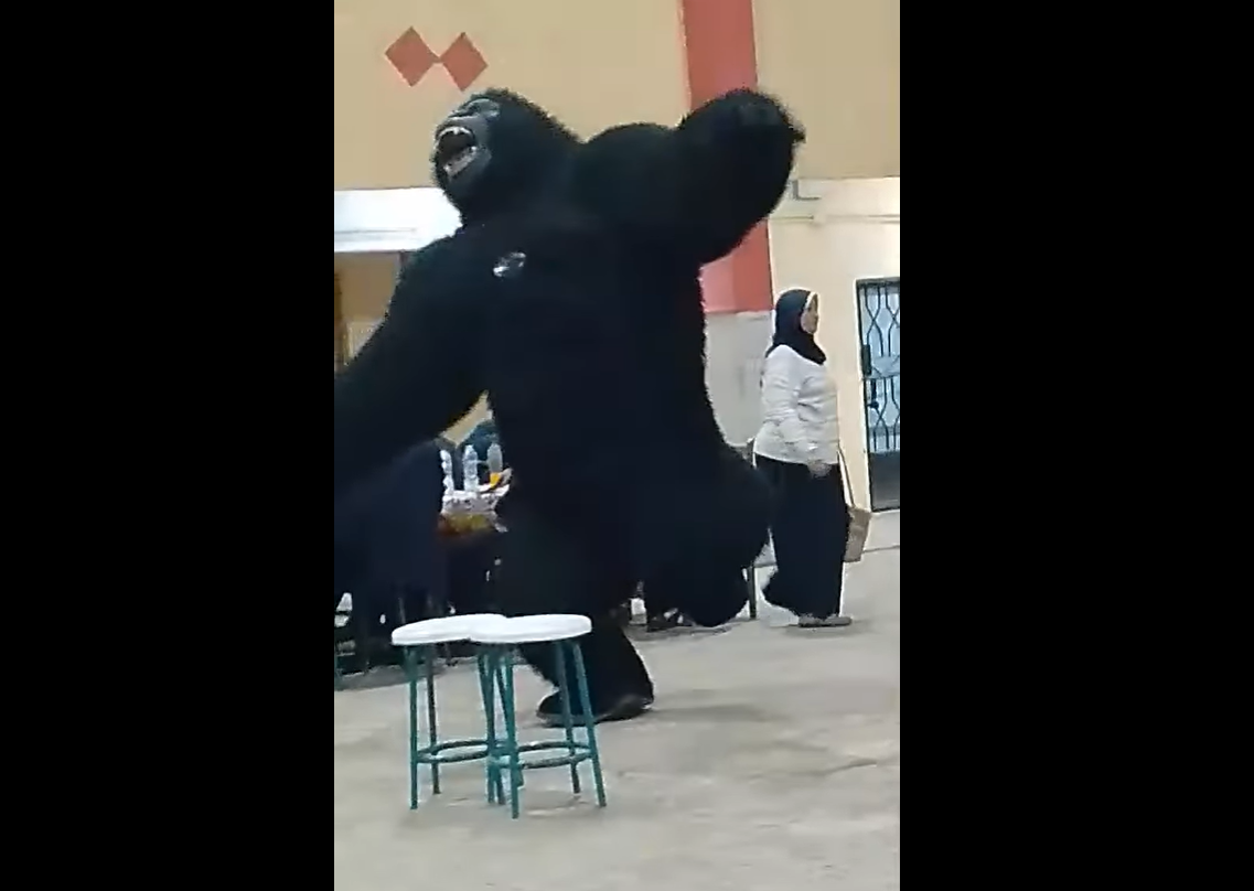 وتم الاستعانة في هذا الحفل ، بشخص يرتدي شكل “غوريلا” ويتراقص وسط الطلاب مع الاغاني الشعبية ، وسط حضور المعلمين