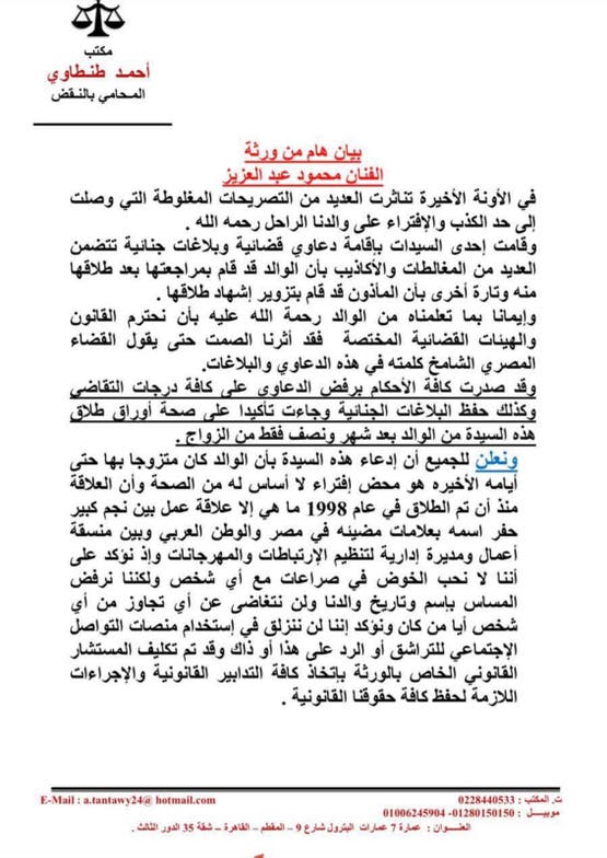 واختتم البيان: “ونعلن للجميع أن ادعاء هذه السيدة بأن الوالد كان متزوجا بها حتى أيامه الأخيرة هو محض افتراء ولا أساس له من الصحة، وأن العلاقة منذ أن تم الطلاق في 1998 ما هي إلا علاقة بين نجم كبير حفر اسمه بعلامات مضيئة في مصر والوطن العربي، وبين منسقة أعمال مديرة إدارية لتنظيم الارتباطات والمهرجانات وإذ نؤكد على أننا لا نحب الخوض في صراعات من أي شخص ولكننا نرفض المساس باسم وتاريخ والدنا، ولن نتغاضي عن أي تجاوز من أي شخص أيا من كان، ونؤكد أننا لن ننزلق في استخدام منصات التواصل الاجتماعي للتراشق أو الرد على هذا أو ذالك وقد تم تكليف المستشار القانوني الخاص بالورثة باتخاذ كافة التدابير القانونية والإجراءات اللازمة لحفظ كافة حقوقنا القانونية”.
