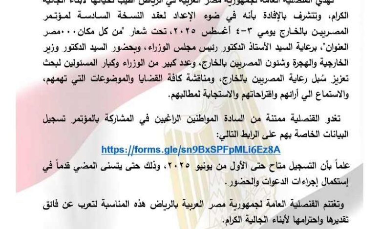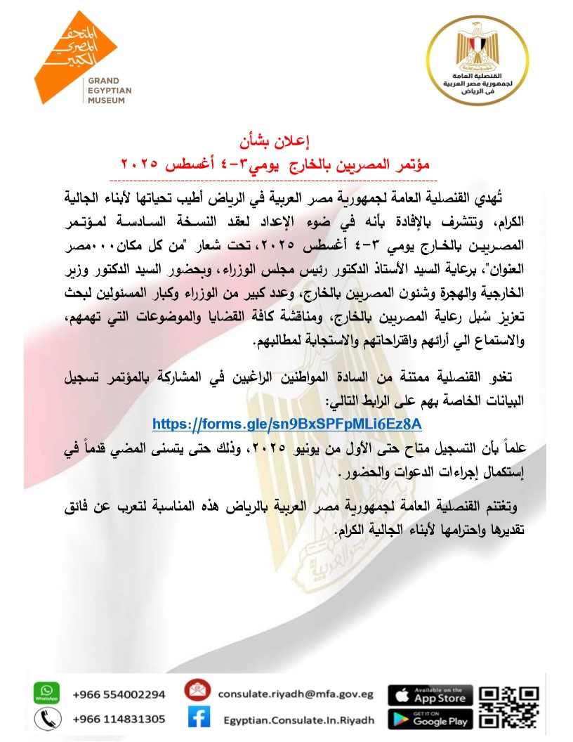 أعلنت القنصلية المصرية في الرياض أنه في ضوء الاعداد للنسحة السادسة لمؤتمر المصريين بالخارج يومي 3- 4 أغسطس 2025 تحت عنوان “من كل مكان.. مصر العنوان” برعاية رئيس مجلس الوزراء ووزير الخارجية والهجرة وشئون المصريين بالخارج، وعدد كبير من الوراء وكبار المسئولين لبحث سبل رعاية المصريين بالخارج، ومناقشة كافة الموضوعات والقضاية التي تهمهم والاستماع إلى أرائهم واقتراحاتهم والاستجابة لمطالبهم