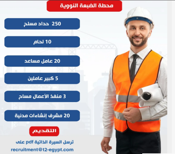 أعلن محمد جبران، وزير العمل، اليوم الخميس عن توفير فرص عمل جديدة للشباب المصري، وذلك داخل مشروع محطة الضبعة النووية بمحافظة مطروح، حيث تم توفير 308 فرصة عمل فى التخصصات التالية: (250 حداد مسلح، 10 لحام، 20 عامل مساعد، 5 كبير عاملين، 3 منفذ الأعمال مساح، 20 مشرف إنشاءات مدنية).على أن يكون التقديم من اليوم الخميس الموافق 22 مايو 2025، ولمدة 5 أيام، وأن ترسل السيرة الذاتية على الإيميل التالى: recruitment@t2-egypt.com.