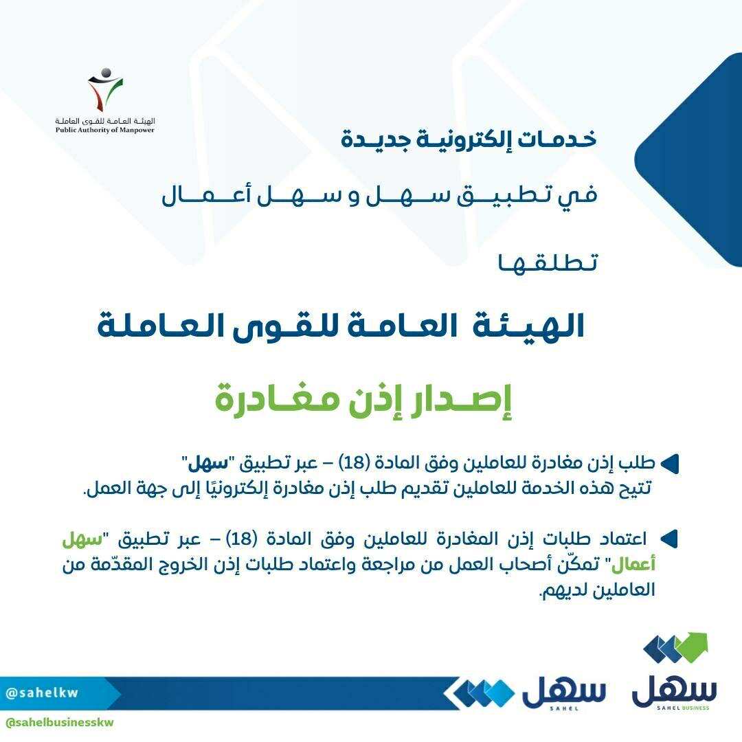 خدمة اعتماد طلبات إذن الخروج للعاملين (مادة 18) عبر تطبيق سهل أعمال، والتي تتيح لصاحب العمل مراجعة واعتماد الطلبات المقدمة من العاملين لديهم بشكل إلكتروني مباشر.