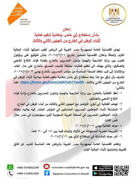 أعلنت القنصلية المصرية بالرياض أنه إلحاقا بإعلان القنصلية بتاريخ 11 فبراير 2025، بشأن التوقيع على بروتوكول تعاون بين وزارة الخارجية والهجرة وشؤون المصريين بالخارج وقيادة قوات الدفاع الشعبي والعسكري، والذي يهدف إلى تنظيم فعاليات مختلفة للشباب المصري بالخارج على مدار العام، وبالإشرة إلى قرب انعقاد النسخة السادسة من مؤتمر المصريين بالخارج، يومي 3-4 أغسطس 2025، تتشرف بأن ترفق مع هذا رابط استطلاع رأي بشأن إمكانية تنظيم فعالية لأبناء الوطن من الجيلين الثاني الثالث