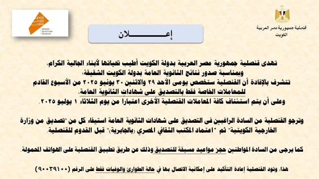 أعلنت القنصلية العامة لجمهورية مصر العربية بدولة الكويت عن بدء التصديق على شهادات الثانوية العامة الصادرة من دولة الكويت، وذلك يومي الأحد 29 يونيو والاثنين 30 يونيو 2025.