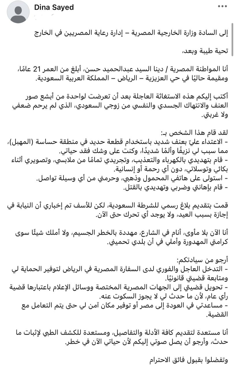 استغاثت دينا حسن بالرئيس عبد الفتاح السيسي رئيس الجمهورية وبوزير الخارجية الدكتور بدر عبد العاطي بعد أن نشرت فيديو لها يوضح تعرضها للضرب العنيف من زوجها السعودي، وقالت دينا حسن من خلال تدوينة لها عبر حسابها علي موقع التواصل الاجتماعي فيسبوك: “أنا المواطنة المصرية دينا السيد عبد الحميد حسن، أبلغ من العمر 21 عامًا، ومقيمة حاليًا في حي العزيزية – الرياض – المملكة العربية السعودية، أكتب إليكم هذه الاستغاثة العاجلة بعد أن تعرضت لواحدة من أبشع صور العنف والانتهاك الجسدي والنفسي من زوجي السعودي، الذي لم يرحم ضعفي ولا غربتي.