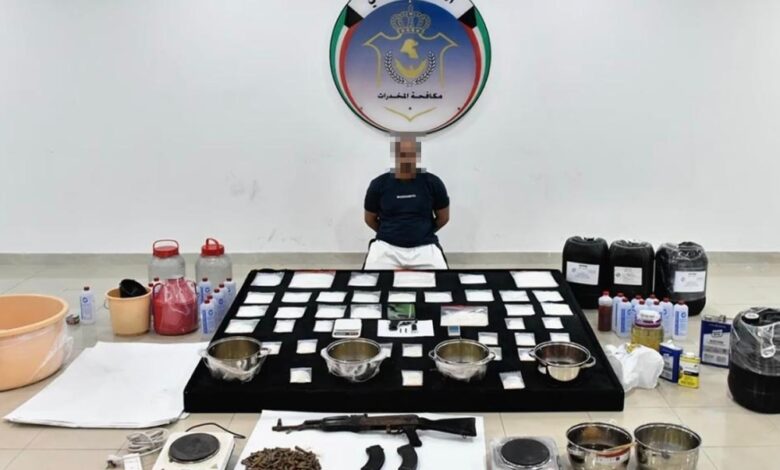 وأسفرت التحريات والمتابعة الميدانية عن رصد أنشطته الإجرامية، حيث تبين قيامه بتصنيع الشبو باستخدام مواد كيميائية مهربة بطرق غير مشروعة، وضبط بحوزته 30 لترًا من المادة الكيميائية الأساسية، و3 لترات من الشبو في المرحلة قبل النهائية، و6 كيلوغرامات من الشبو الجاهز للترويج، إضافة إلى كميات كبيرة من المواد الكيميائية وأدوات التصنيع. وتقدر القيمة السوقية للمضبوطات بنحو 500 ألف دينار كويتي.