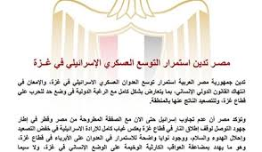 أدانت جمهورية مصر العربية استمرار توسع العدوان العسكري الإسرائيلي في غزة، والإمعان في انتهاك القانون الدولي الإنساني بما يتعارض بشكل كامل مع الرغبة الدولية فى وضع حد للحرب علي قطاع غزة، وللتصعيد الناتج عنها بالمنطقة.
