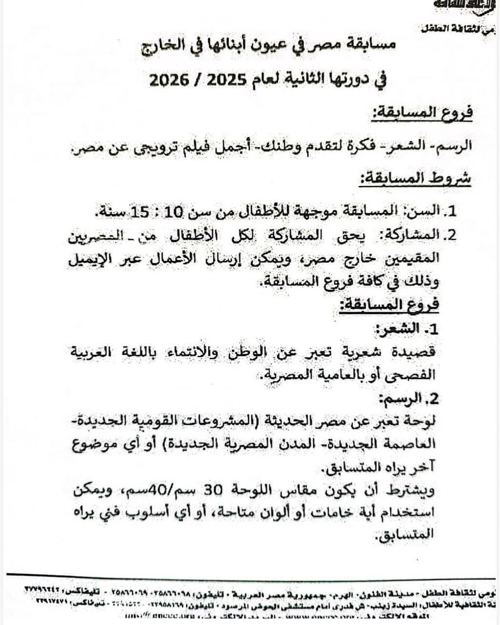 يعلن المكتب الثقافي المصري عن انطلاق مسابقة مصر في عيون أبنائها في الخارج في دورتها الثانية لعام 2026/2025