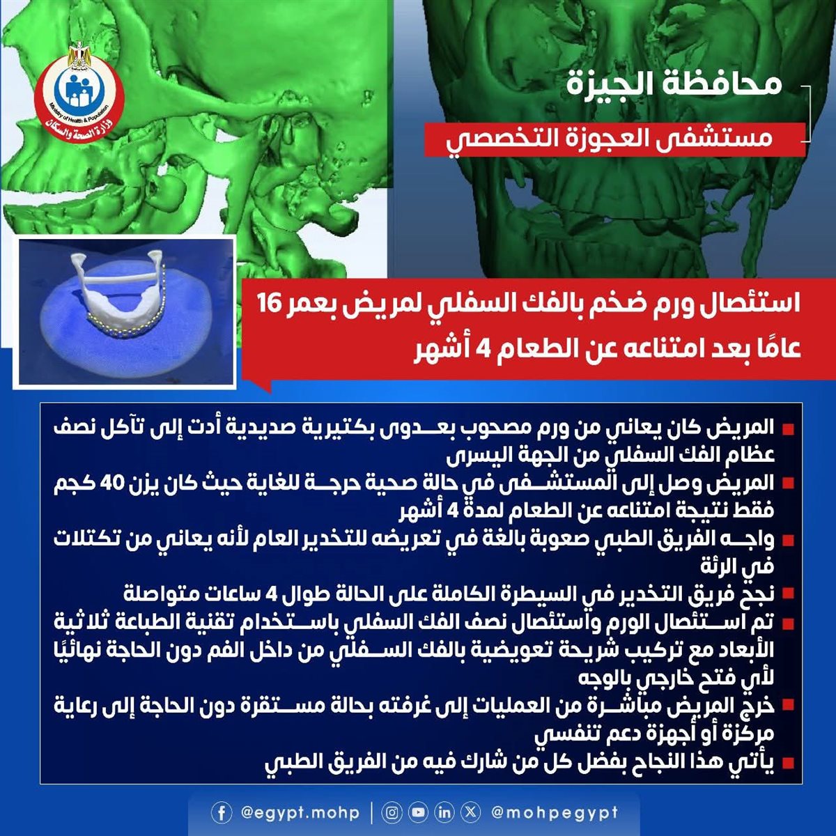 وأوضحت الوزارة أن المريض وصل إلى المستشفى بوزن 40 كجم فقط، نتيجة امتناعه عن تناول الطعام لمدة 4 أشهر متواصلة، بعدما تسبب الورم المصحوب بعدوى بكتيرية صديدية في تآكل نصف عظام الفك السفلي من الجهة اليسرى.