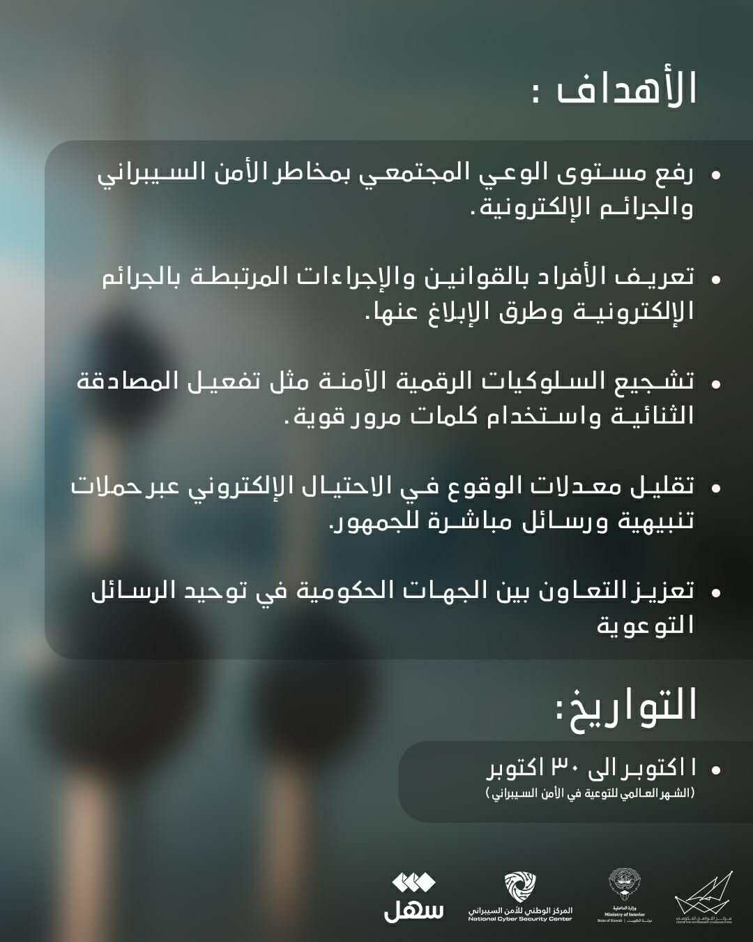 وذكر بيان مشترك أن الحملة تهدف إلى رفع مستوى الوعي المجتمعي بالمخاطر السيبرانية الحديثة، وتمكين الأفراد من حماية بياناتهم وحساباتهم الرقمية، بالتعاون مع التطبيق الحكومي الموحد للخدمات الإلكترونية (سهل) ومركز التواصل الحكومي.