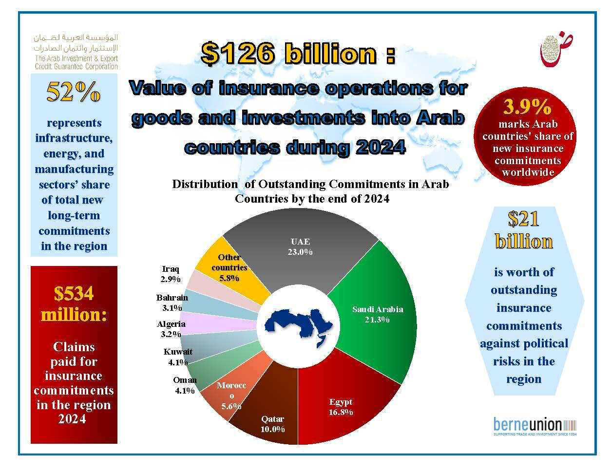 واصلت عمليات تأمين ائتمان الصادرات الموجهة للدول العربية في مختلف الآجال استحواذها على النصيب الأكبر من الالتزامات الجديدة بحصة 95%، فيما بلغت حصة التأمين ضد المخاطر السياسية ما نسبته 4%، ونحو 1% للالتزامات الأخرى عبر الحدود.
