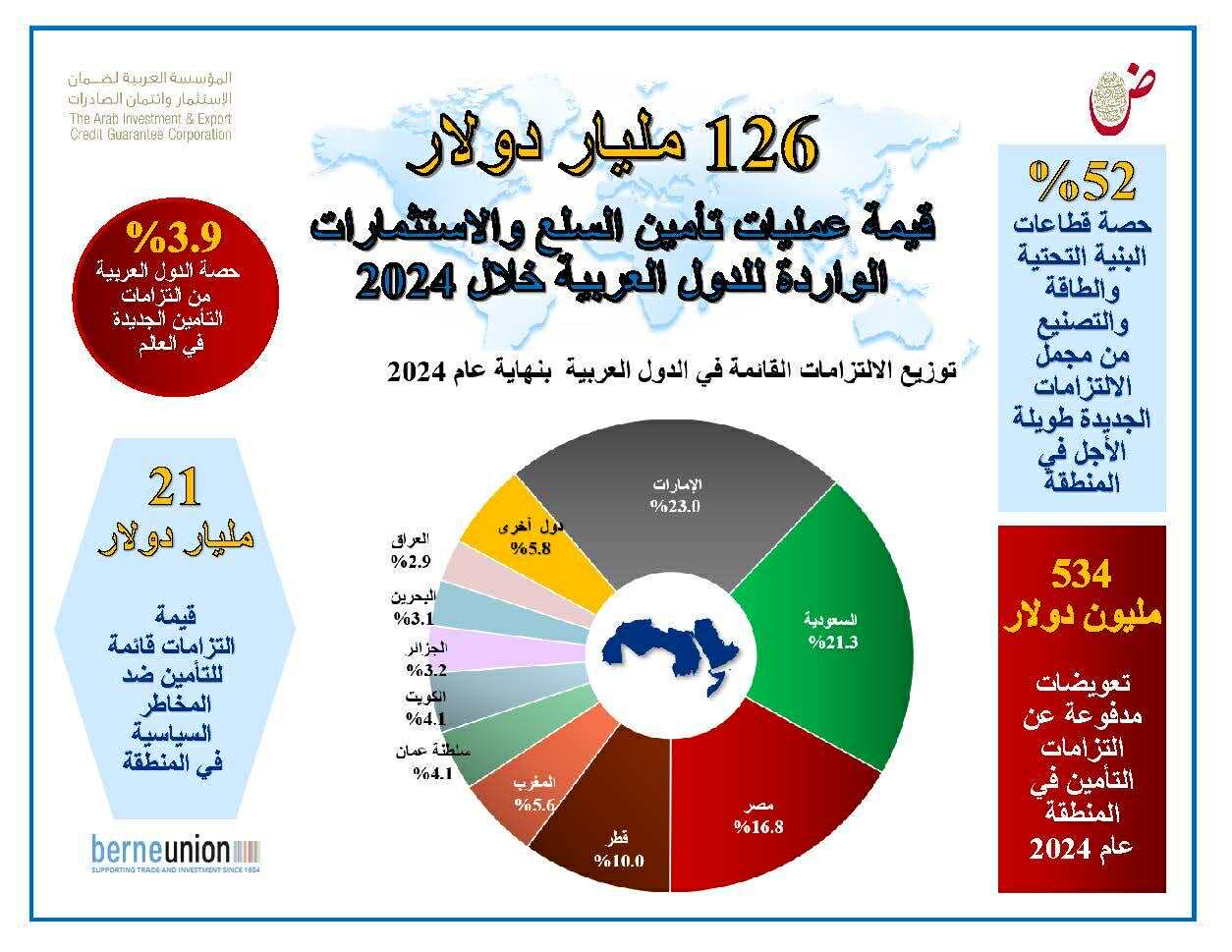 تراجعت حصة الدول العربية إلى 3.9% من مجمل الالتزامات الجديدة لتأمين التجارة والاستثمار والتمويل في العالم خلال عام 2024.