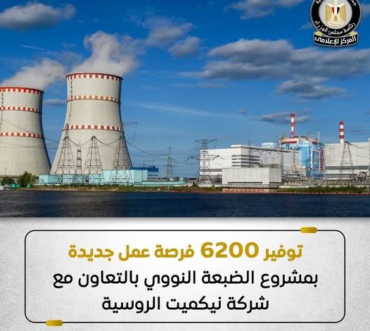 أعلن مجلس الوزراء المصري عن توفير 6200 فرصة عمل في مشروع محطة الضبعة النووي بالتعاون مع شركة نيكمينت الروسية