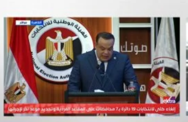 أعلن المستشار حازم بدوي رئيس الهيئة الوطنية للانتخابات، خلال مؤتمر إعلان النتيجة الرسمية للمرحلة الأولى من انتخابات مجلس النواب إلغاء الانتخابات فى 19 دائرة انتخابية وهى 1 بالجيزة و4 دوائر فى قنا و7 فى سوهاج و2 فى الفيوم و1 فى الإسكندرية و3 فى البحيرة.