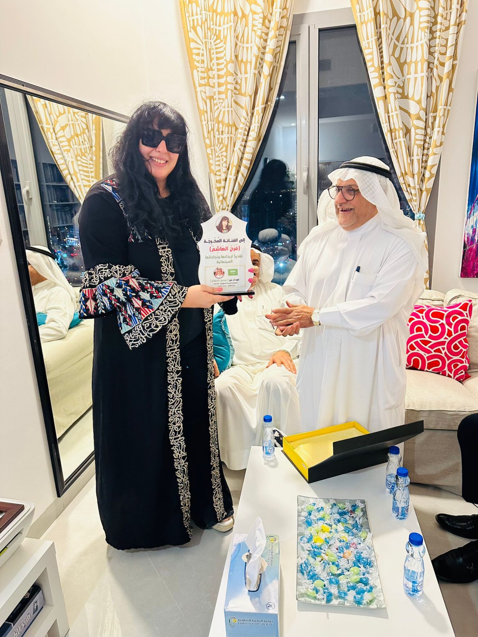 وقبل أن يبدأ النقاش الأساسي وموضوع الندوة وهو (مقاييس النجاح) قدم الشاعر محمد الجلواح درعا تذكاريا للمخرجة فرح الهاشم تقديرا منه لنجاحاتها السينمائية المتعددة وبالأخص فيلمها الأخير الذي أحدث ضجة كبرى (هرتلة في القاهرة).