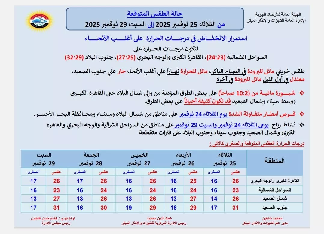 أعلنت الهيئة العامة للأرصاد الجوية عن توقعاتها لحالة الطقس خلال الفترة من الثلاثاء 25 نوفمبر 2025 حتى السبت 29 نوفمبر 2025، مشيرة إلى استمرار الانخفاض الملحوظ في درجات الحرارة على أغلب الأنحاء، بما يعكس أجواء خريفية مائلة للبرودة في الصباح الباكر والليل، ومائلة للحرارة نهاراً على مناطق جنوب الصعيد.