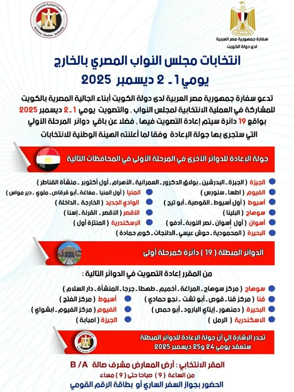 وأوضحت السفارة أن التصويت سيشمل 19 دائرة سيتم إعادة الانتخابات فيها، إلى جانب بقية الدوائر التي ستخضع لجولة الإعادة في المرحلة الأولى، وذلك وفقًا لما أعلنته الهيئة الوطنية للانتخابات.