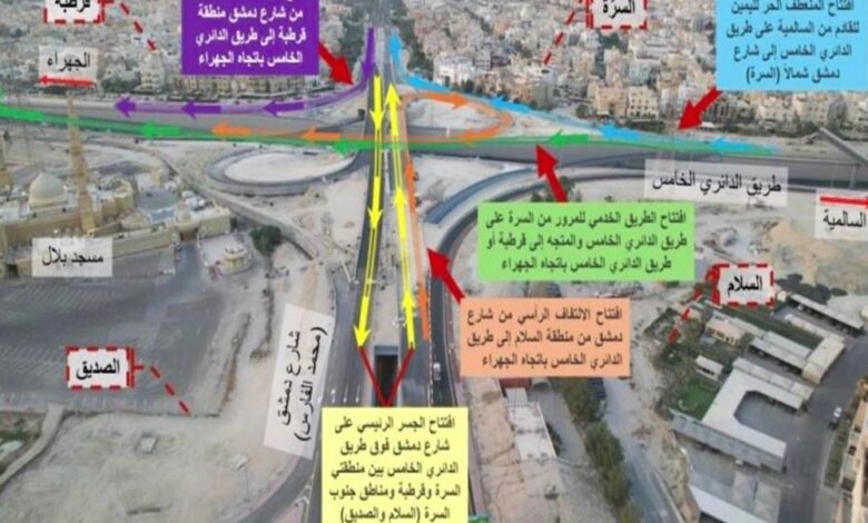 أعلنت الهيئة العامة للطرق والنقل البري، أنه سيتم بالتعاون مع الإدارة العامة للمرور، افتتاح أجزاء من تقاطع طريق الدائري الخامس مع شارع دمشق أمام الحركة المرورية، وذلك اعتباراً من الساعة الـ12 مساء اليوم «ليل الأحد – الإثنين».