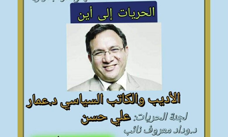 وتستضيف الندوة الأديب والكاتب السياسي د. عمار علي حسن، في لقاء مفتوح يتناول قضايا الحريات العامة ودور المثقف في الدفاع عنها، وذلك بمشاركة عدد من الأكاديميين والمثقفين.