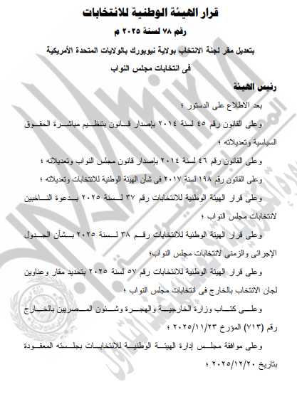 نشرت الجريدة الرسمية اليوم قرار الهيئة الوطنية للانتخابات برئاسة القاضي حازم بدوى بتغيير مقر وعنوان لجنة الانتخاب بولاية نيويورك بالولايات المتحدة الأمريكية في انتخابات مجلس النواب إلى مقر بعثة مصر الدائمة لدى الأمم المتحدة في نيويورك والكائن في 304 East 44th Street, New York, NY, United States, New York، بدلا من مقر القنصلية العامة في نيويورك الكائن في 1110 Second Avenue, suite #201 New York, NY.10022، وذلك خلال الانتخابات التي تجرى خارج جمهورية مصر العربية أيام 24 و25 ديسمبر الجاري، على أن تعود إلى مقرها الأصلى بمقر القنصلية العامة في نيويورك بعد انتهاء هذين التاريخين.