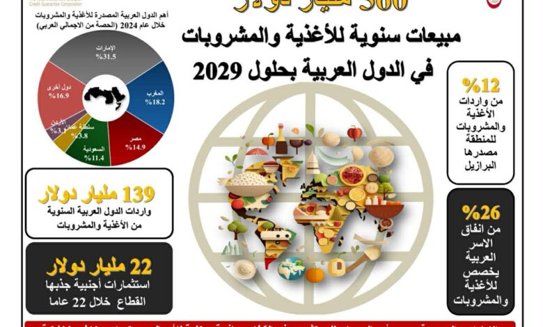 ورجح التقرير ارتفاع مبيعات الأغذية والمشروبات غير الكحولية في المنطقة العربية (16 دولة) بمعدل 8.6% لتتجاوز 430 مليار دولار بنهاية عام 2025، لتمثل 4.2% من الإجمالي العالمي، مع توقعات بأن تتجاوز تلك المبيعات 560 مليار دولار عام 2029.