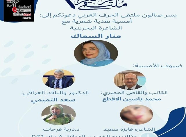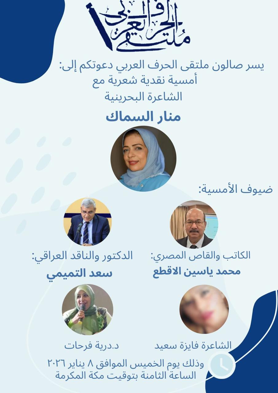 وجه صالون ملتقى الحرف العربي الدعوة إلى أمسية نقدية شعرية مع الشاعرة البحرينية، منار السماك، يوم الخميس 8 يناير 2026، الساعة الثامنة مساء بتوقيت مكة المكرمة