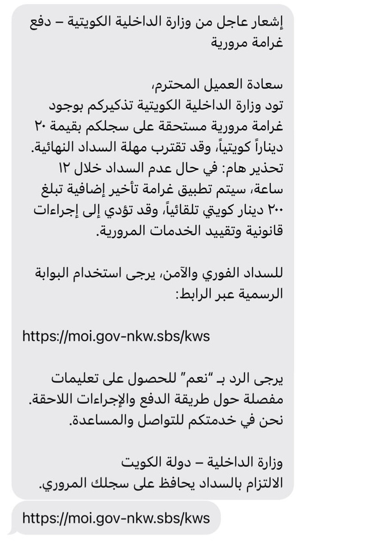 تلقى عدد من المواطنين في الكويت خلال الأيام الماضية رسائل نصية تدّعي وجود مخالفات مرورية مسجلة عليهم وتطالبهم بسدادها فورًا عبر روابط إلكترونية، قبل أن يتبين أن تلك الرسائل احتيالية وتنتحل صفة وزارة الداخلية الكويتية بهدف الاستيلاء على البيانات الشخصية والبنكية.