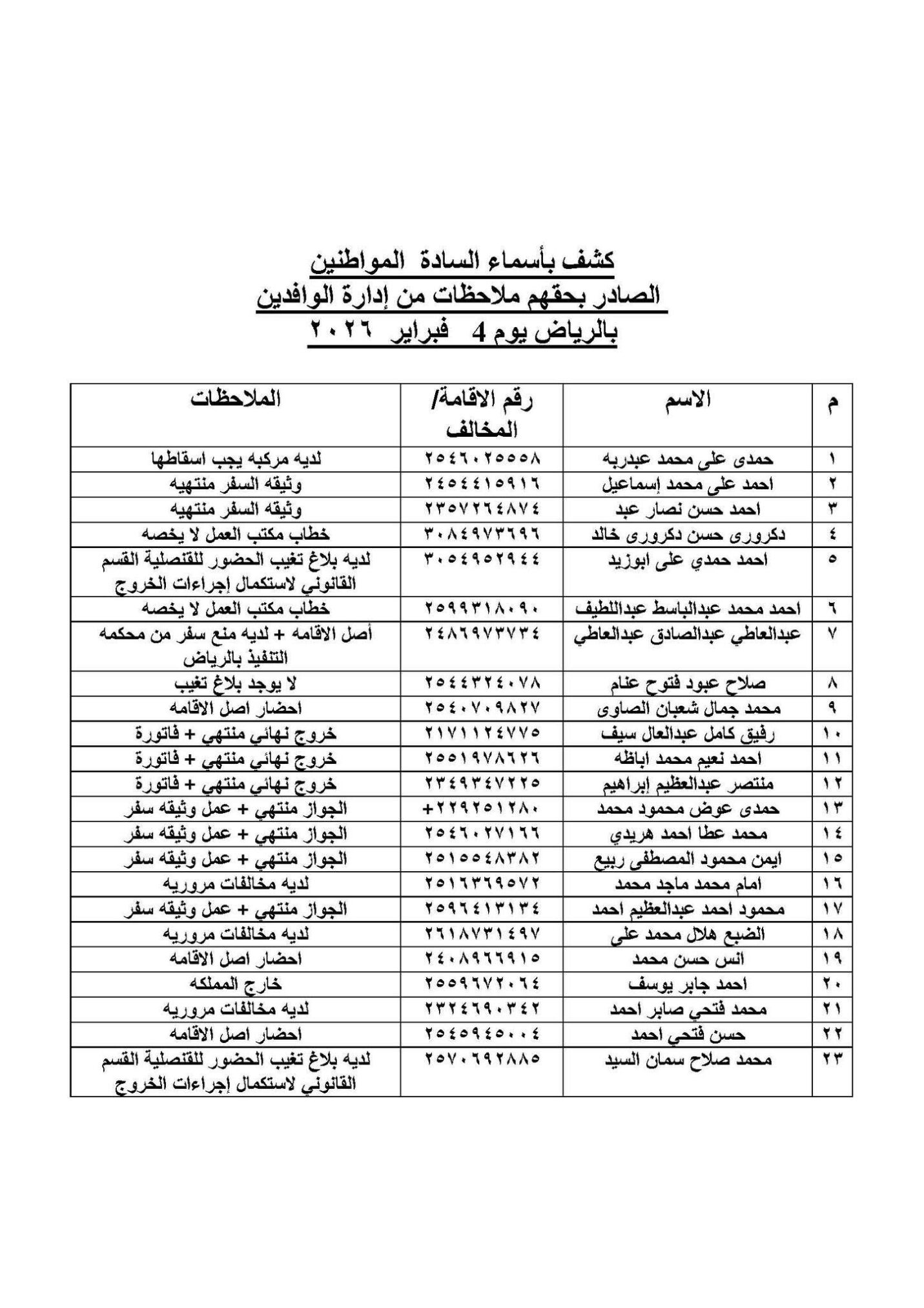 أعلنت الفنصلية المصرية بالرياض عن صدور كشف بأسماء عدد من المواطنين الذين سُجلت بحقهم ملاحظات من إدارة الوافدين بمدينة الرياض، وذلك بتاريخ 4 فبراير 2026، في إطار الإجراءات التنظيمية المعمول بها.