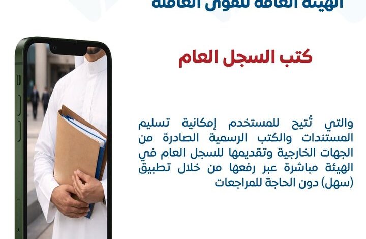 أعلنت الهيئة العامة للقوى العاملة عن إطلاق خدمة إلكترونية جديدة عبر تطبيق سهل تحت اسم “كتب السجل العام”. الخدمة تتيح للمستخدمين إمكانية تسليم المستندات والكتب الرسمية الصادرة من الجهات الخارجية وتقديمها مباشرة إلى السجل العام في الهيئة، من خلال رفعها إلكترونيًا عبر التطبيق دون الحاجة للتوجه شخصيًا أو إجراء مراجعات.
