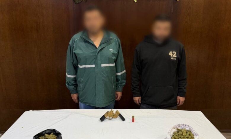 وعقب تقنين الإجراءات، تمكنت قوة أمنية من ضبط المتهمين، وعُثر بحوزتهما على نحو 2 كيلو جرام من مخدر الهيدرو، ومبلغ مالي يُشتبه في كونه من متحصلات نشاطهما، إضافة إلى سلاح ناري «فرد خرطوش» وطلقة من ذات العيار، وهاتفين محمولين.