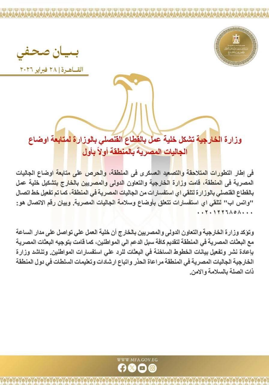 أعلنت وزارة الخارجية والهجرة وشؤون المصريين بالخارج تشكيل خلية عمل بالقطاع القنصلي لمتابعة أوضاع الجاليات المصرية في المنطقة، وذلك في ضوء التطورات المتلاحقة والتصعيد العسكري الراهن، وحرصًا على سلامة المواطنين المصريين بالخارج.