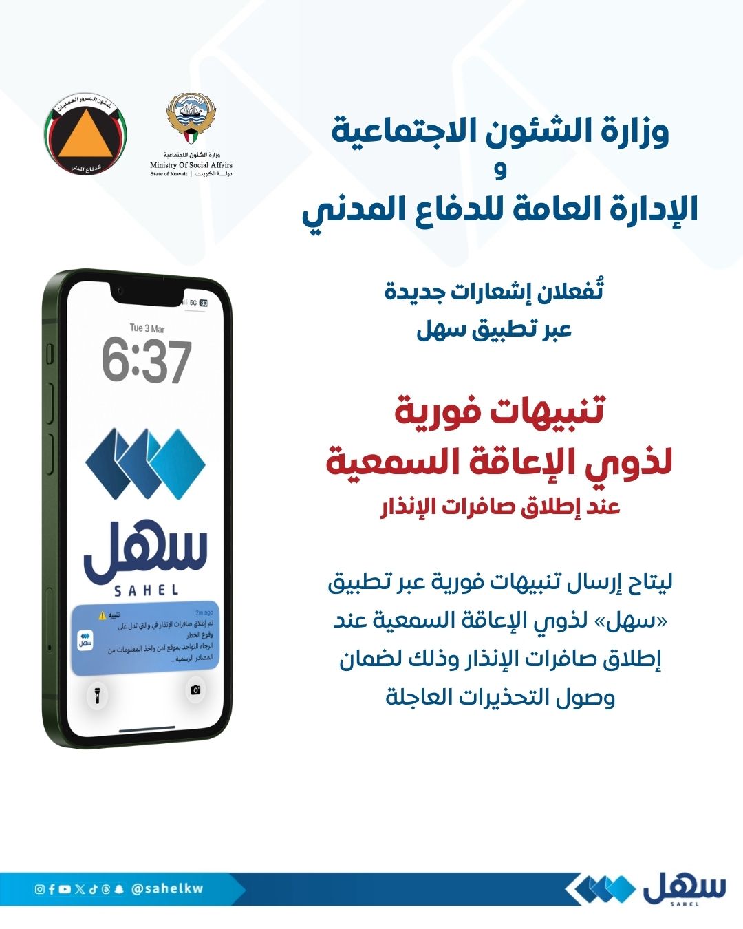 أعلنت وزارة الشؤون الاجتماعية بالتعاون مع الإدارة العامة للدفاع المدني عن تفعيل إشعارات جديدة عبر تطبيق «سهل»، تتيح إرسال تنبيهات فورية لذوي الإعاقة السمعية عند إطلاق صفارات الإنذار، بما يضمن وصول التحذيرات العاجلة إليهم في الوقت المناسب.